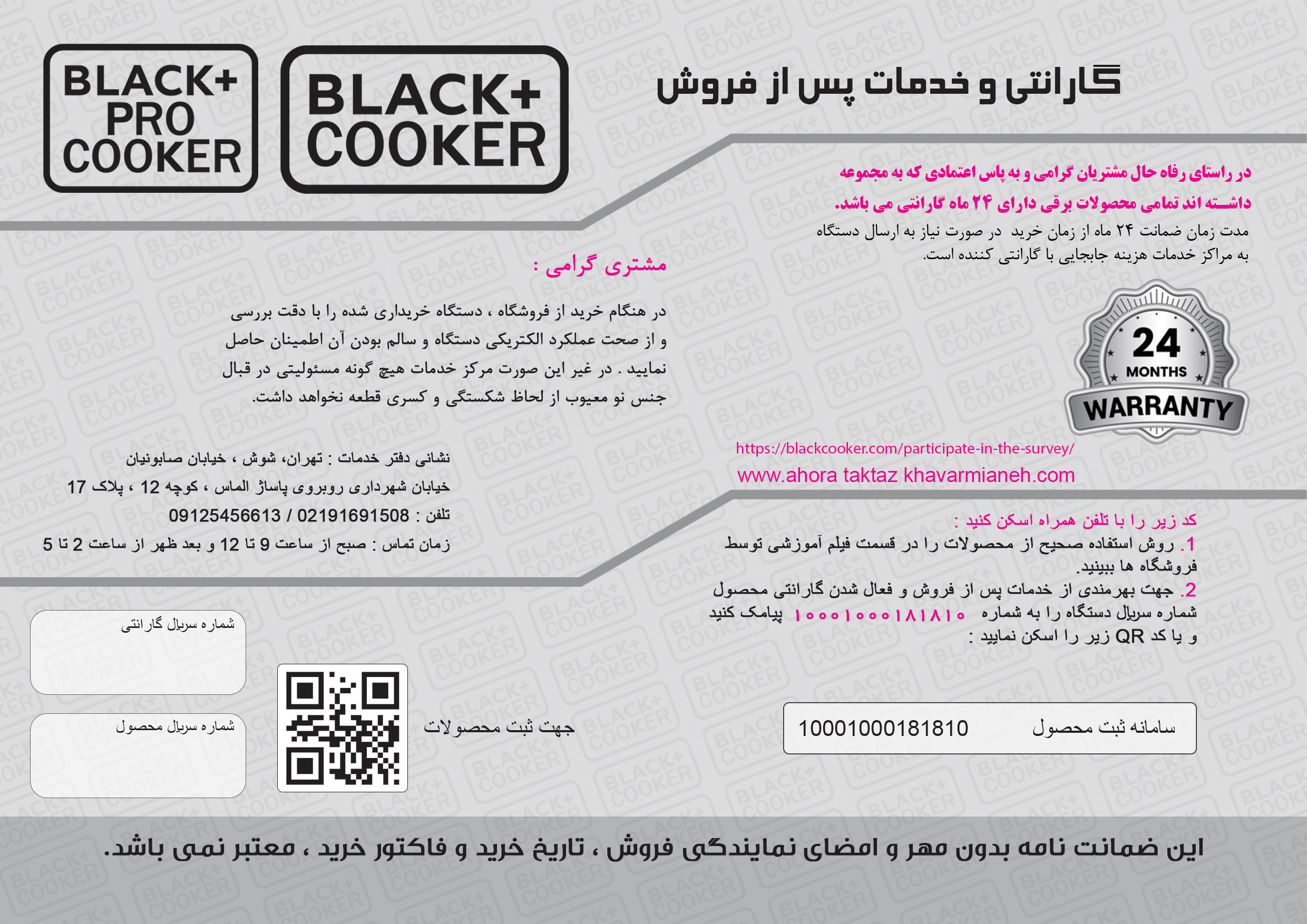امکان خرابی هر محصولی وجود دارد و بدتر از خرابی پیدا نشدن قطعات معیوب شده آن است. با خدمات 60 ماه پس از فروش بلک کوکر از این بابت نگرانی ای نخواهید داشت. خرید لوازم خانگی و محصولات آشپزخانه بی شک یکی از مهم ترین شاخصه هایی که هر مصرف کننده مد نظر خواهد داشته موضوع مهم “گارانتی” است و ما جهت رفع نگرانی و احقاق حقوق مصرف کنندگان لوازم خانگی و آشپزخانه بلک کوکر، گارانتی 24 ماهه مقرر نمود.